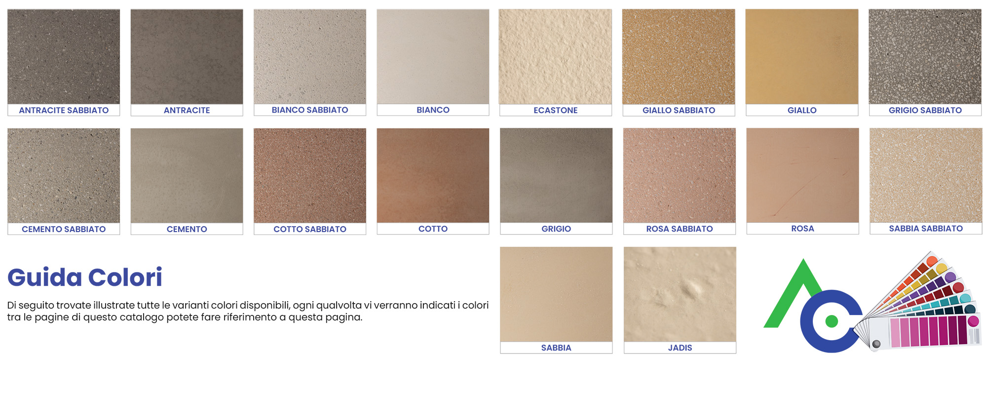 | Colore | Bianco, Sabbia, Giallo Siena, Grigio, Cemento, Antracite, Rosa, Cotto |